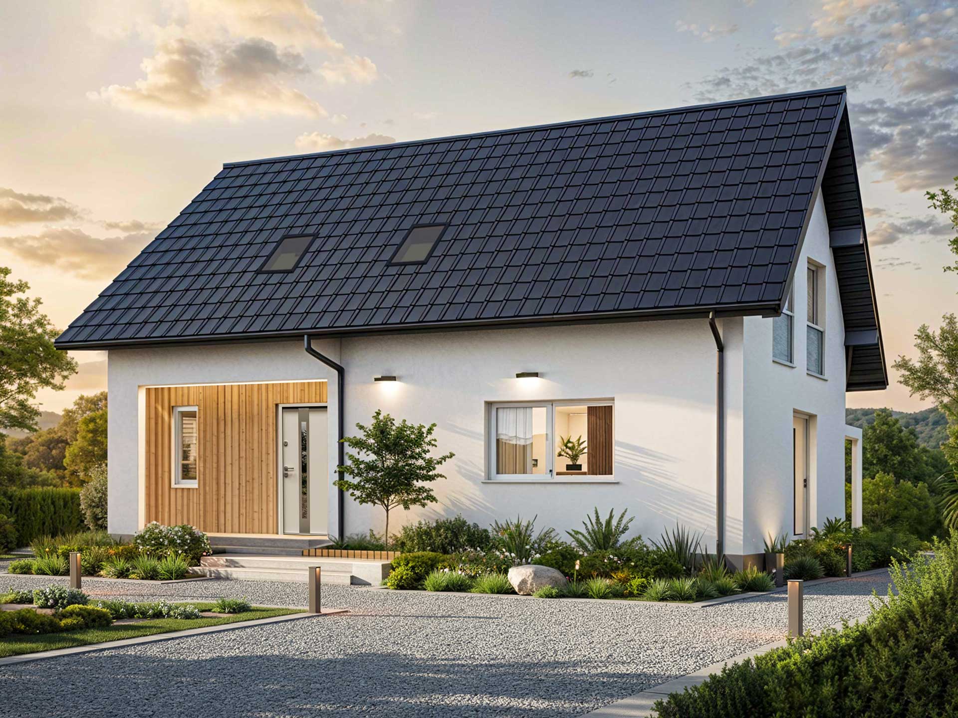 Das Haus ist fertig von außen inkl. Außenputz, Dachverkleidung, Rinnen, Dacheinfassungen, Fenster und Außentür.