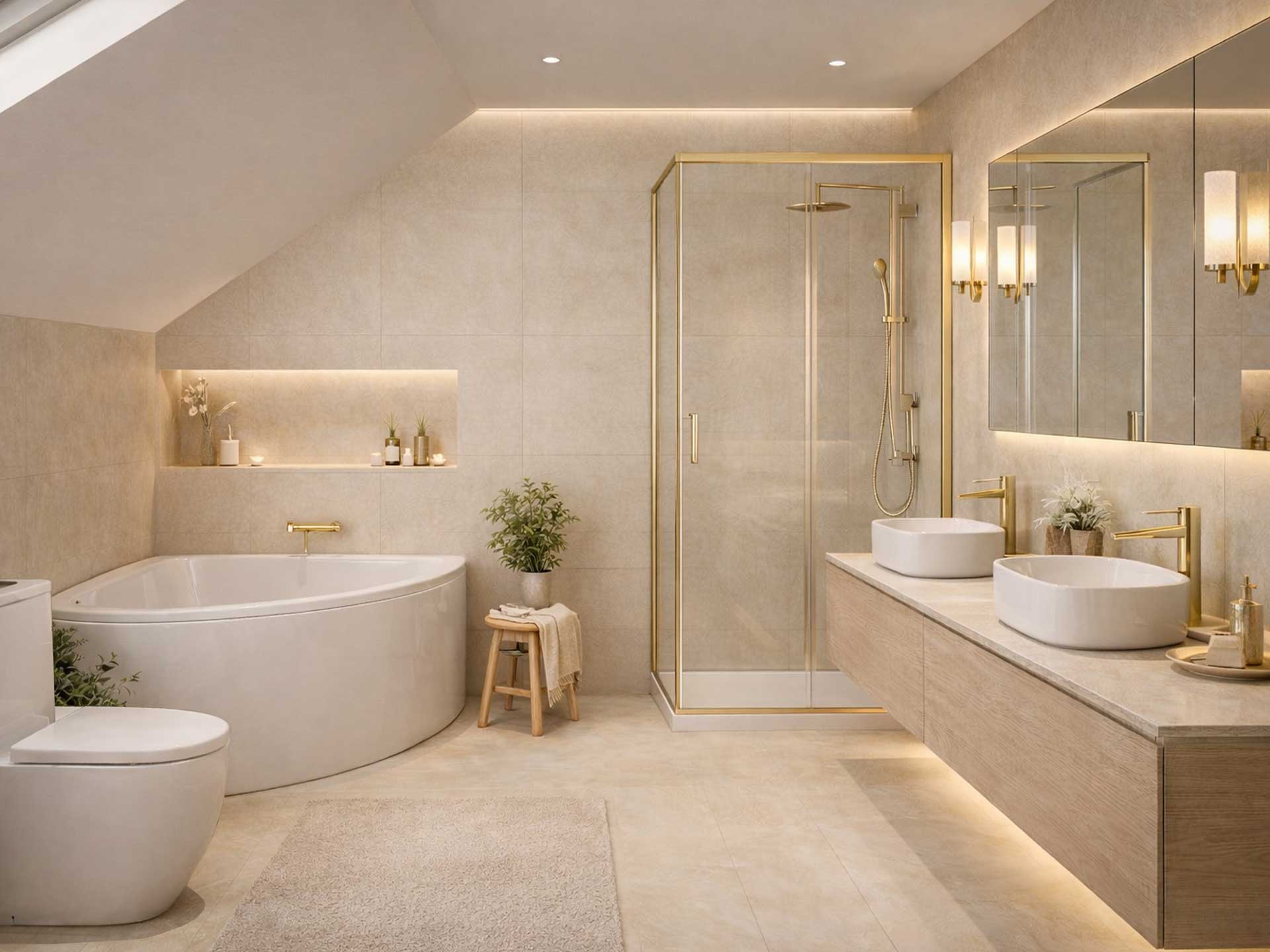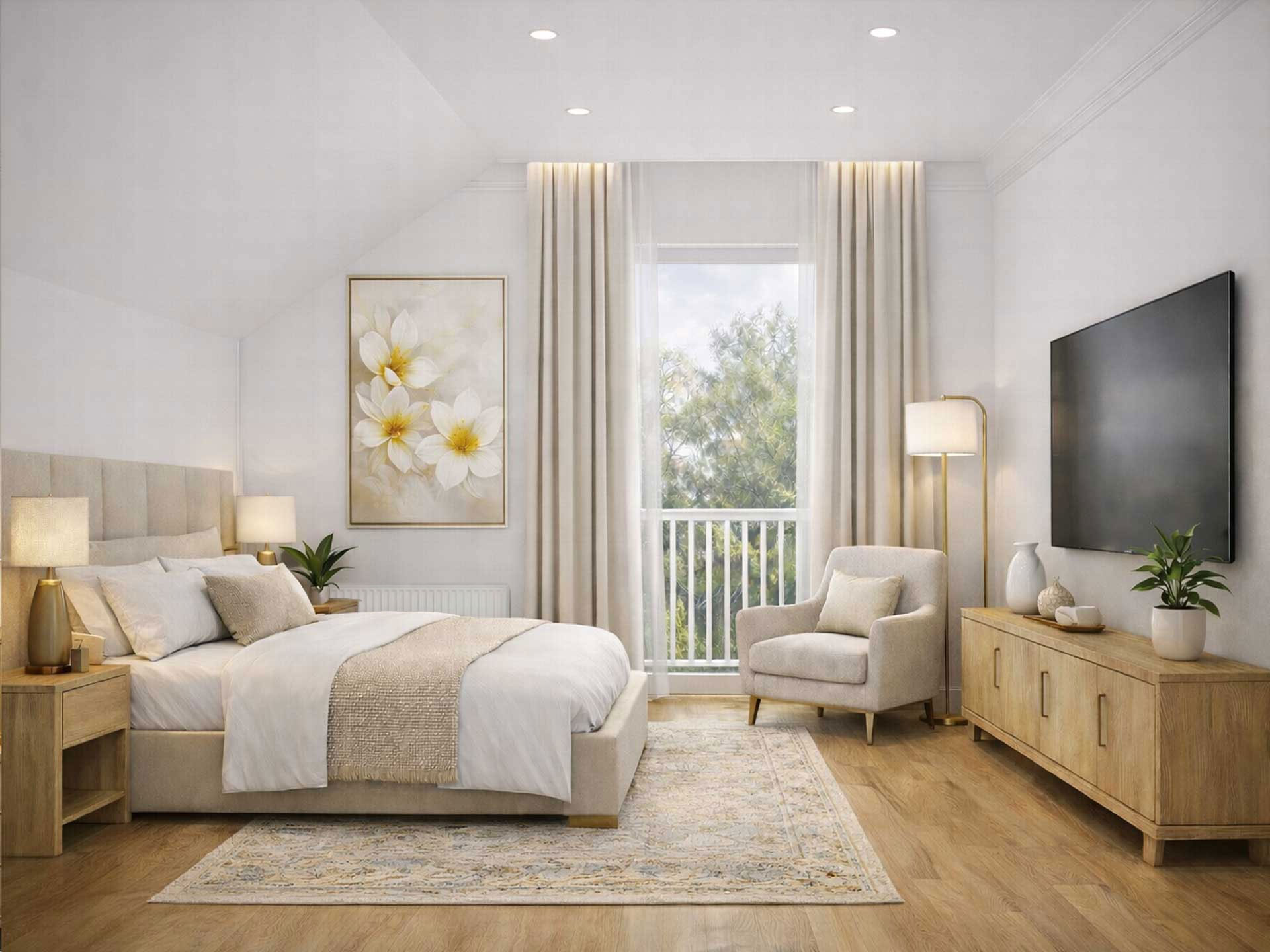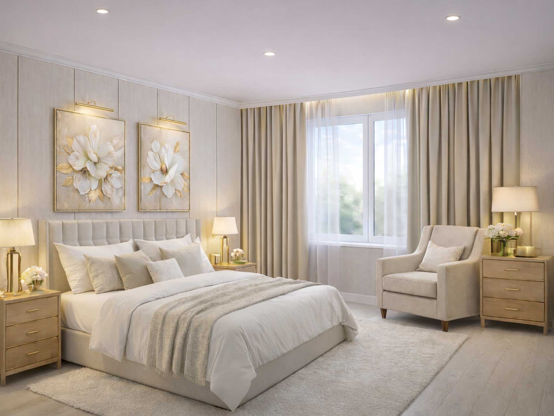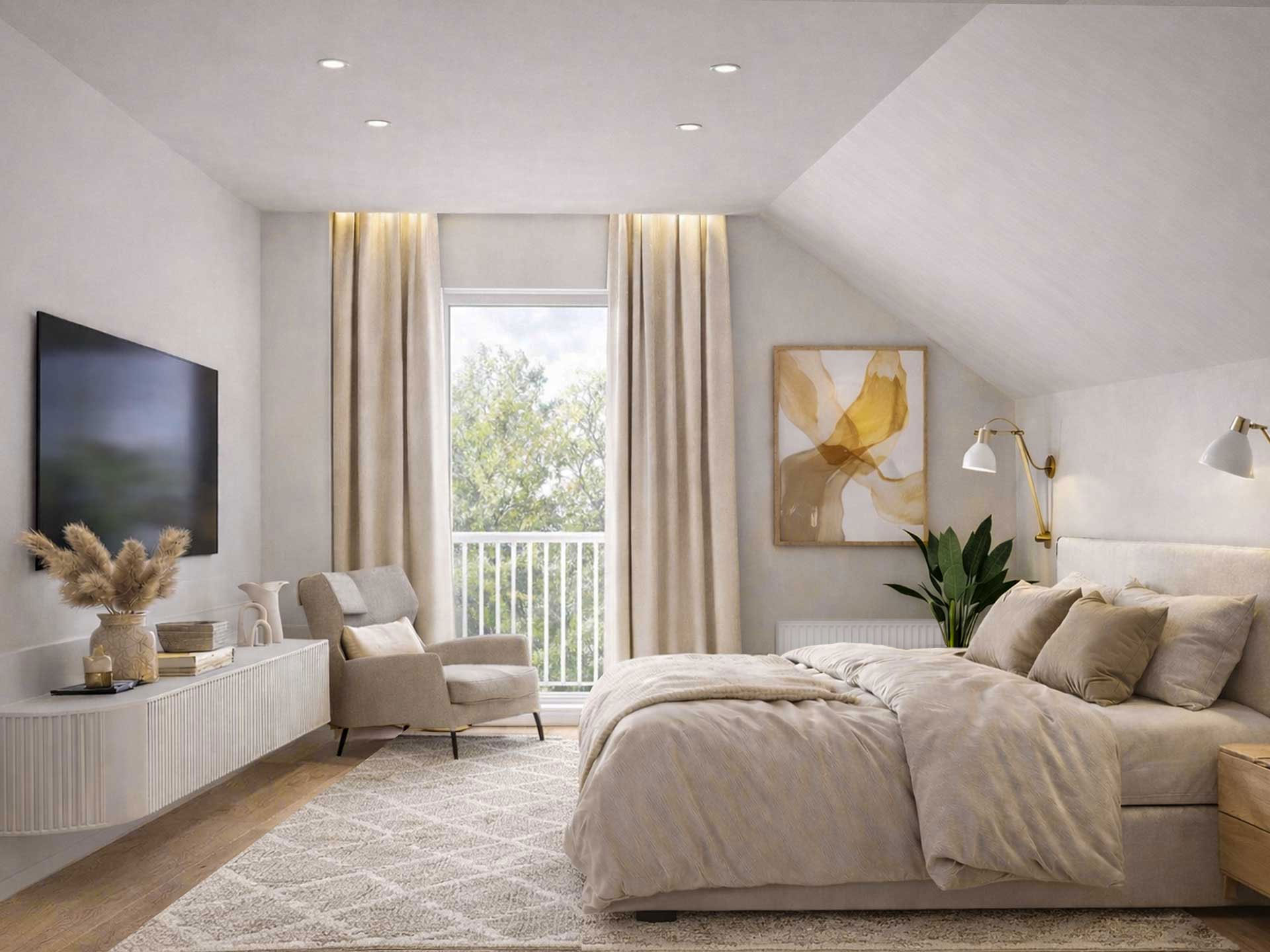 Die Wände sowie Decken sind verspachtelt, geschliffen und weißgestrichen.