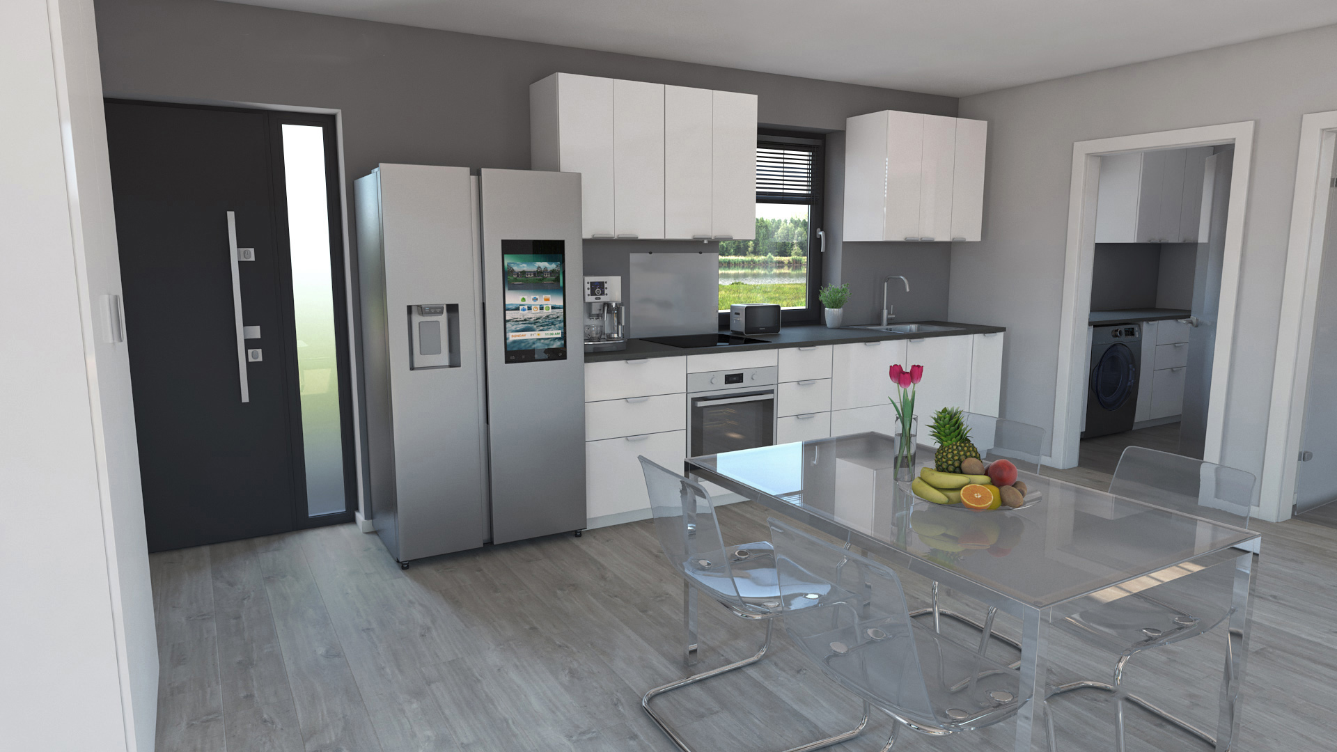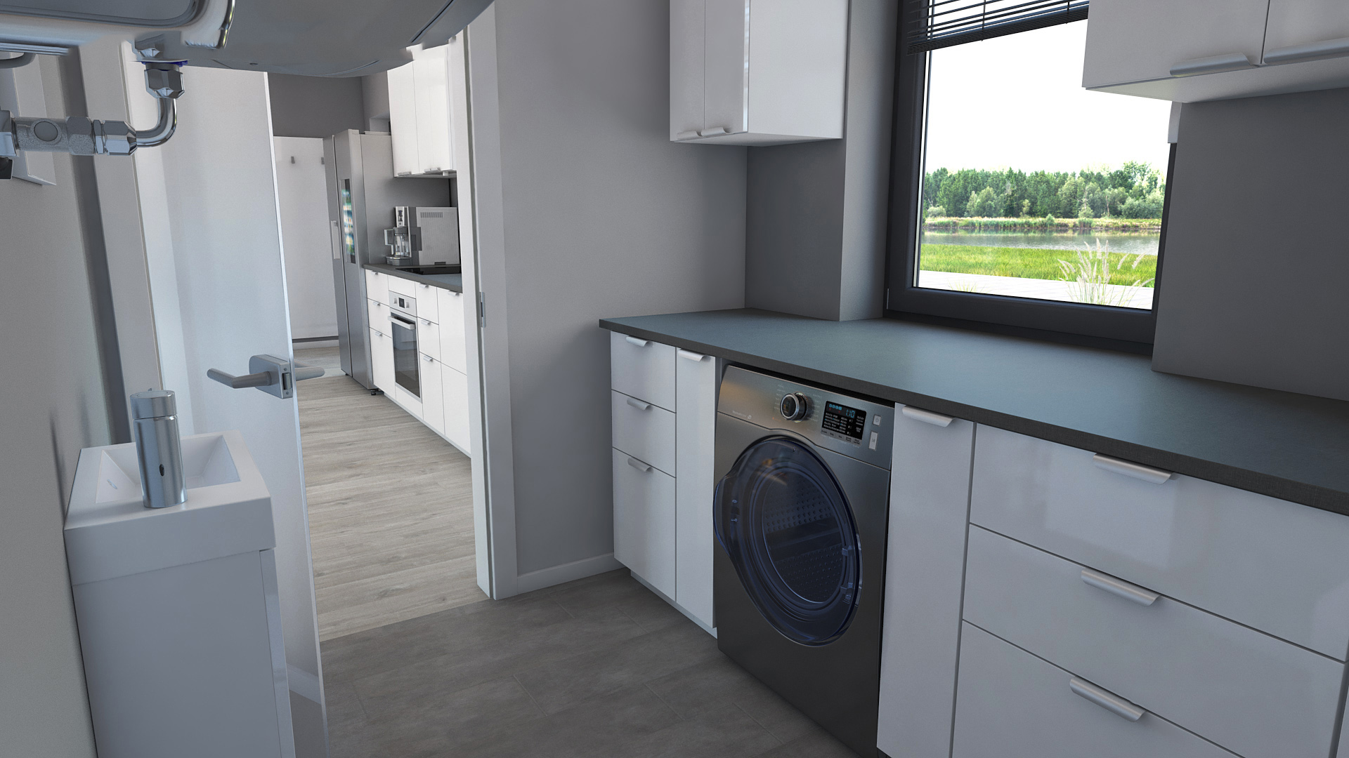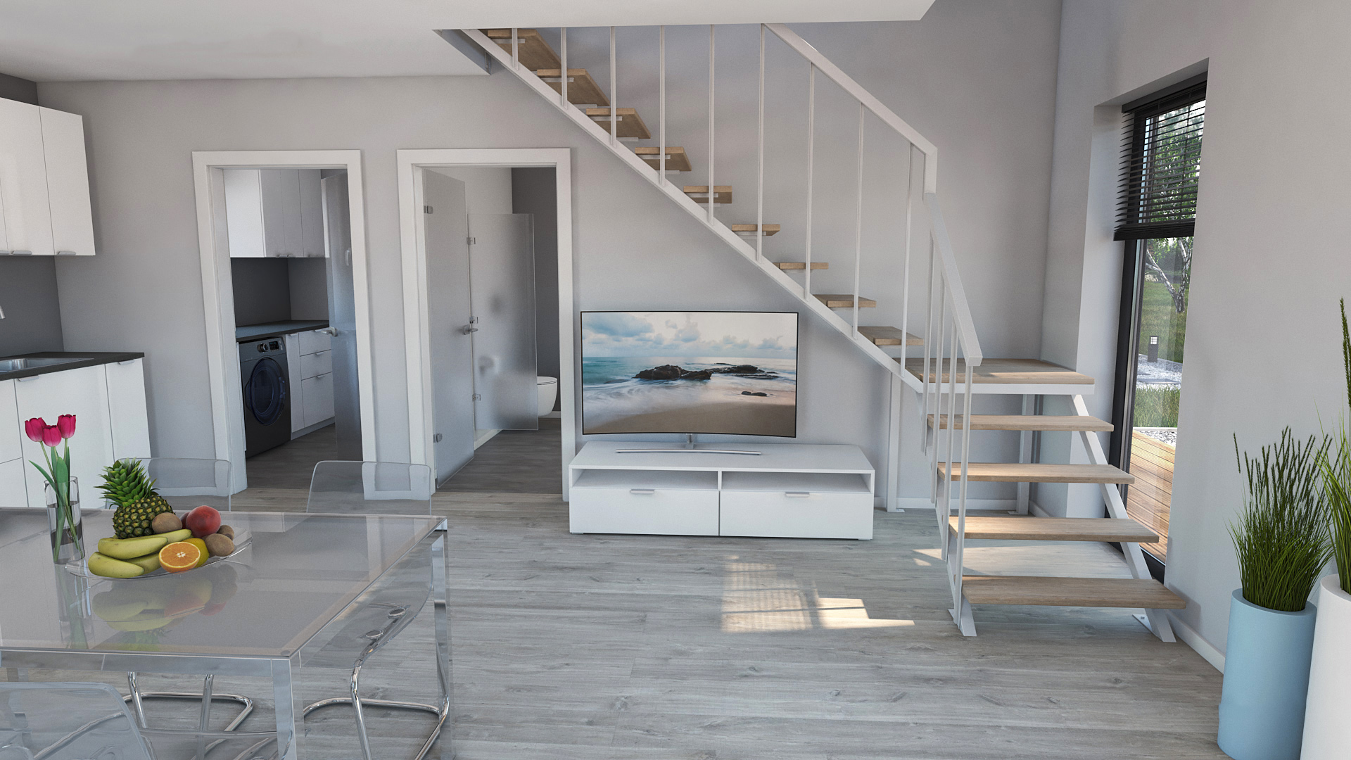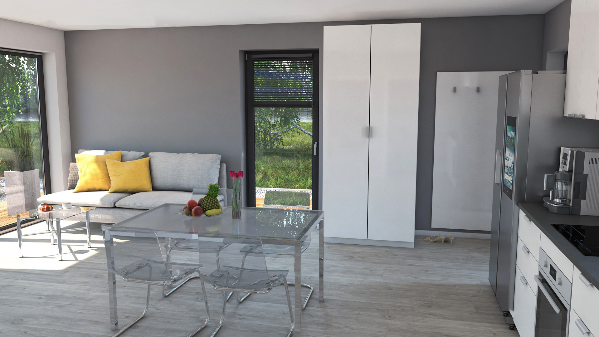 Das Haus ist so konstruiert, dass im nächsten Schritt standardmäßig die Elektro-/Wasser-Installationen und Trennwände eingebaut sowie der Oberputz aufgetragen werden können.