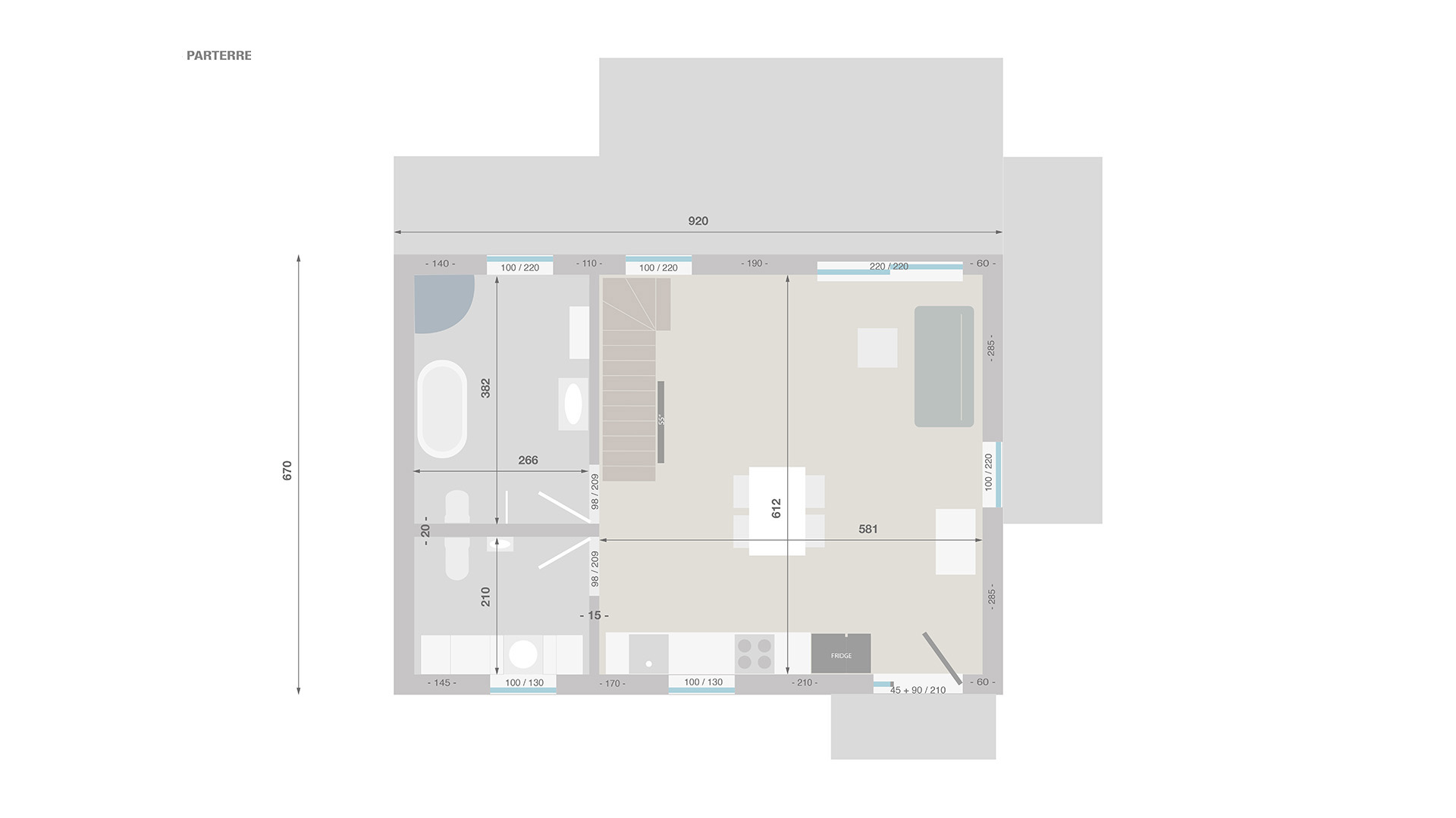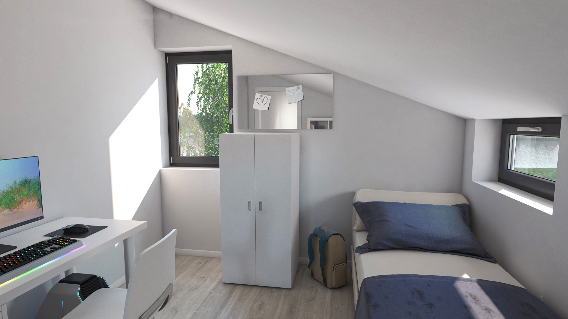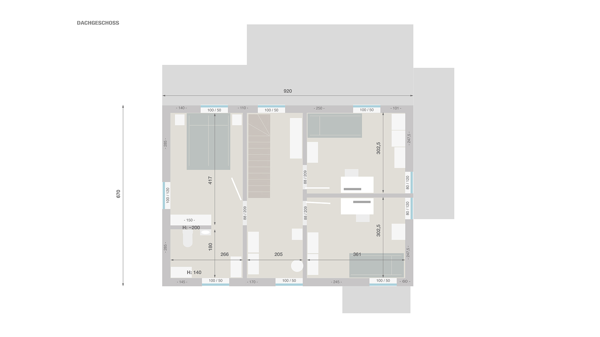 Bebauungsfläche: 62 m2 / Hausbodenfläche: 108 m2 / Dachgeschoss mit 21 Grad Neigung und 1,4m Kniestock
